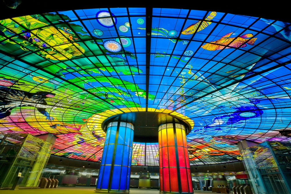 기차역 중심부에 4,500여 개의 색 유리판이 모여 환한 빛의 예술을 만들어내는 곳이 있습니다. 빛의 돔은 세계에서 가장 큰 유리 공예품 중 하나입니다. 이탈리아 예술가 나르치수스 콰글리아타(Narcissus Quagliata)가 디자인한 이곳은 수많은 색 유리가 모여 인간의 삶에 대한 이야기를 하고 있다고 합니다. 인생을 단계별로 나타냈다는 작품의 주제도 있습니다. 이러한 주제로는 물: 인생의 자궁, 땅: 번영과 성장, 빛: 창조적 정신, 불: 파괴와 재탄생 등이 포함됩니다. 작품은 빨간색과 파란색의 두꺼운 두 개 기둥과 연결되어 있습니다. 많은 파란색, 녹색 및 빨간색은 동물과 신화속 창조물을 의미한다고 합니다. 지름이 약 30미터에 달하는 거대한 돔은 기차역의 커다란 일부를 차지하고 있으면 어디서든 눈에 띄게 됩니다. 독일에서 4년에 걸쳐 완성한 돔을 대만으로 옮겨왔다고 합니다. 이 역은 대만 민주주의를 이루는 데 도움이 된 집회를 기념하는 곳이라고 합니다.