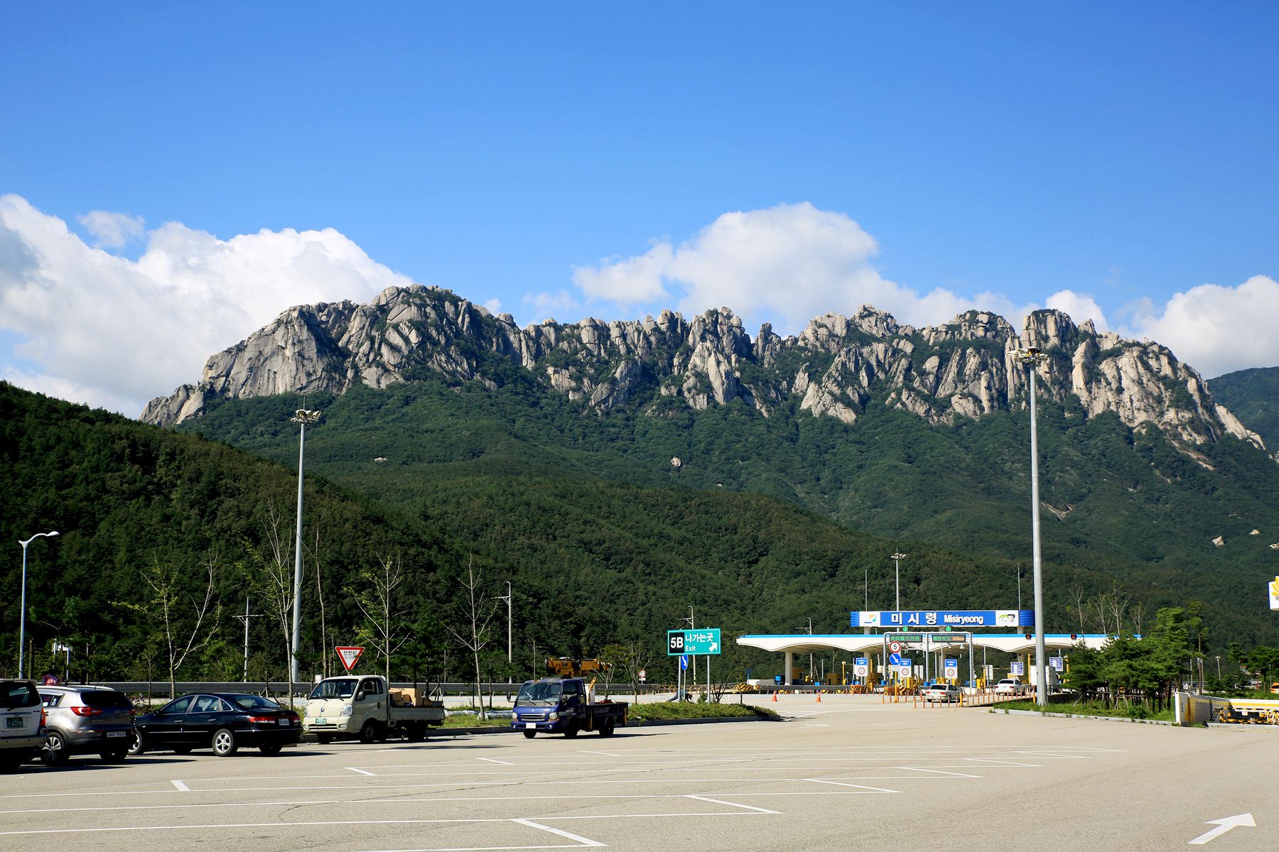 고성의 화암사 가는 길, 대명콘도 골프장, 옛 미시령 길에서 볼 수 있습니다. 미시령터널을 통과하면 오른쪽으로 울산바위를 감상할 수 있는 전망대가 마련되어 있는데, 이곳에서 울산바위를 바라보면 높이 솟은 기암절벽과 절벽의 아래를 둘러싼 푸른빛이 장관을 이룹니다.