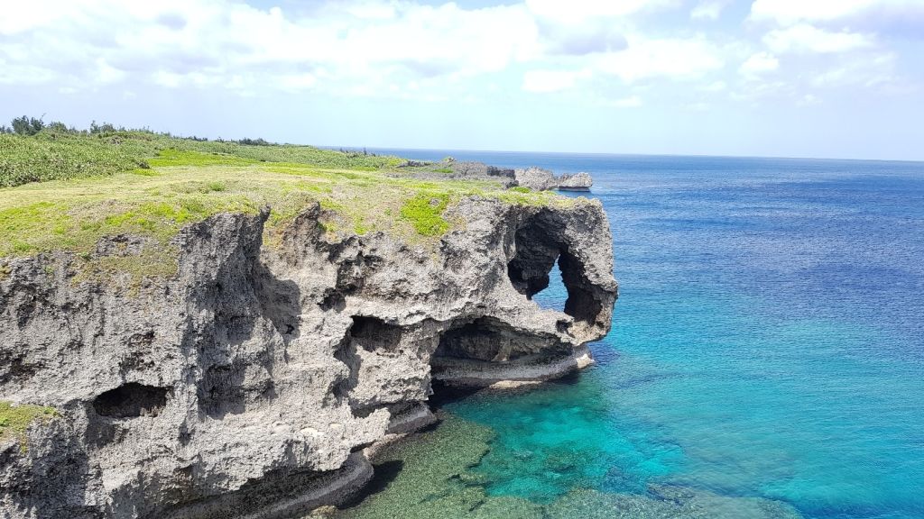 18세기 류큐왕국의 쇼케이왕이 이 벌판을 보고 만 명이 앉아도 넉넉한 벌판이라고 감탄한 데서 만좌모라는 이름이 유래하였다고 합니다. 석회암이 침식되어 만들어진 절벽과 푸른 바다가 어우러진 곳으로 오키나와의 절경 중 하나입니다. 만좌모 해안의 일부분은 융기한 산호가 날카로운 모양으로 굳어진 곳으로 독특한 지형을 이루고 있습니다. 코끼리 코를 닮은 기암절벽이 특징입니다. 신비한 풍경뿐만 아니라 잔디와 산책로가 마련되어 있습니다. 수평선 너머 오키나와의 북부 지역이 마주 보이고, 아름다운 해안선을 따라 고급 리조트가 늘어서 있습니다.