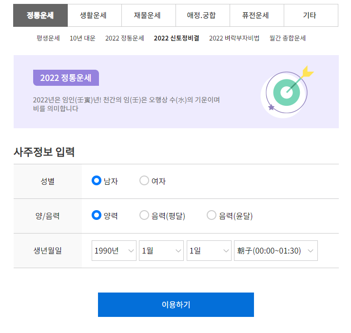 운세/사주 페이지에는 월간종합운세, 평생운세, 2022신토정비결, 2022부자되기가 있습니다. 현재는 2022로 되어있지만 들어가게 되면 2023으로 되어있으니 그냥 사용하셔도 무방합니다.