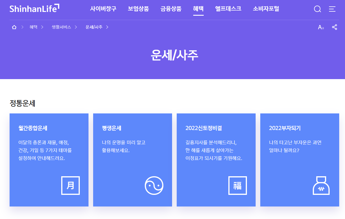 무료운세 바로가려면 신한 라이프를 검색하면 나오는 사이트로 이동하거나 글 아래쪽에 바로가기 링크를 이용하시면 됩니다. 검색을 하셨다면 사이트 접속 후에 위에 보이는 혜택에서 생활서비스 아래쪽에 있는 운세/사주로 들어가면 됩니다.