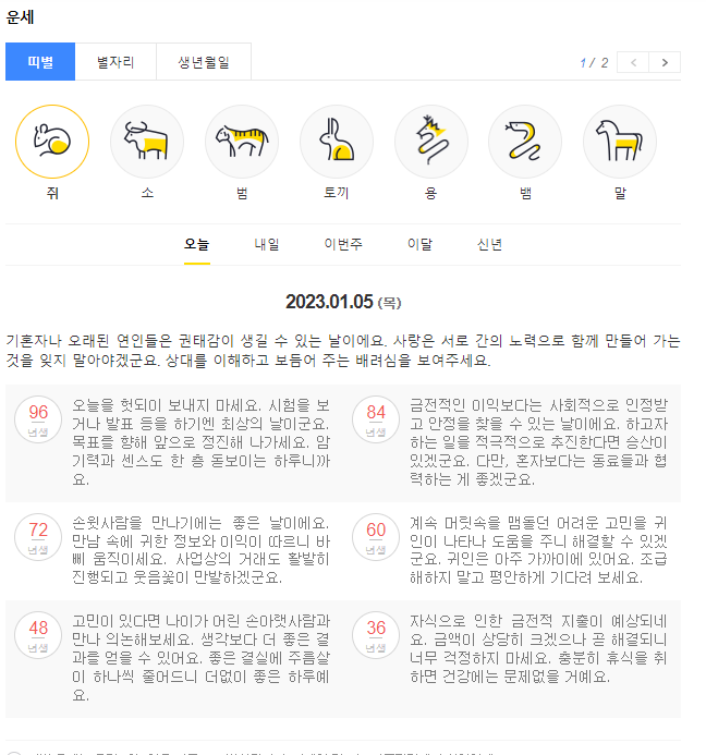 다음 포털에서도 무료로 신년운세를 볼 수가 있습니다. 무료운세나 생년월일 운세를 검색하시면 무료로 신년운세, 이달 운세, 별자리 운세, 띠별 운세 등 다양하게 무료로 이용하실 수 있습니다.