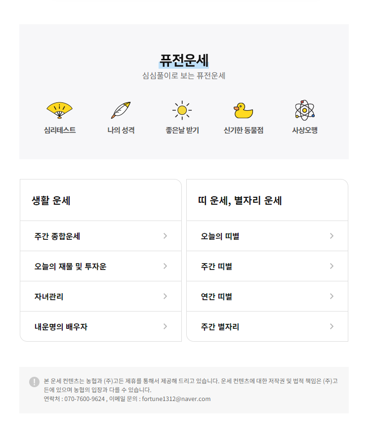 농협 신비운입니다. 정통 운세, 평생 운세, 퓨전 운세, 이지함 토정비결 등 다양한 운세가 준비되어 있습니다.